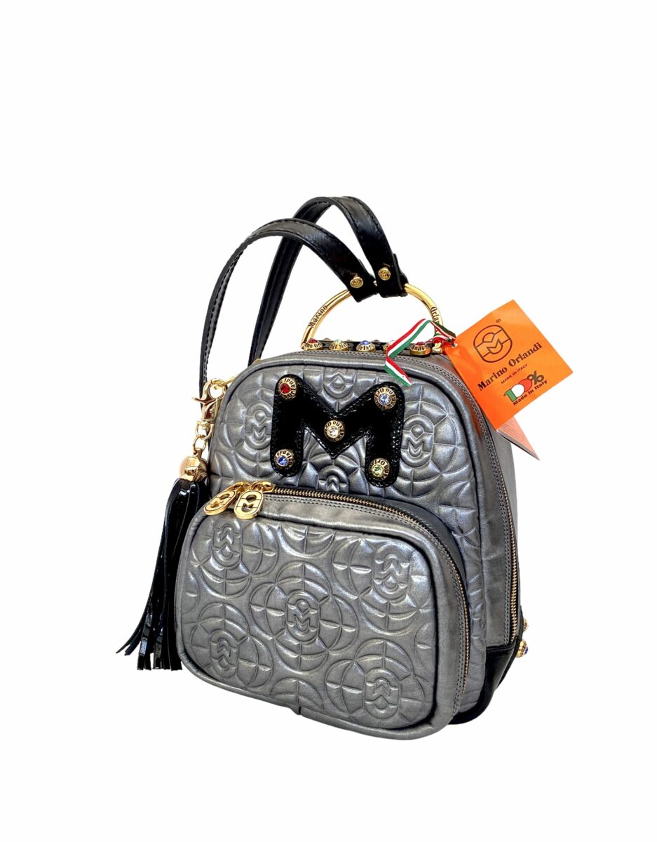 Lo zainetto Royal.MO sembra andare dritta al punto: lo scintillio del grigio metallico unito al motivo geometrico al cui centro si trova il logo.MO conferisce risolutezza e praticità, oltre a tanta voglia di divertirsi alla luce della luna. Pratico ma prezioso oggetto del quotidiano, il contrasto tra l’oro placcato nei dettagli e l’argento della pelle viene risolto dagli Swarovski, che conciliano le due sfumature da sempre percepite come opposte.